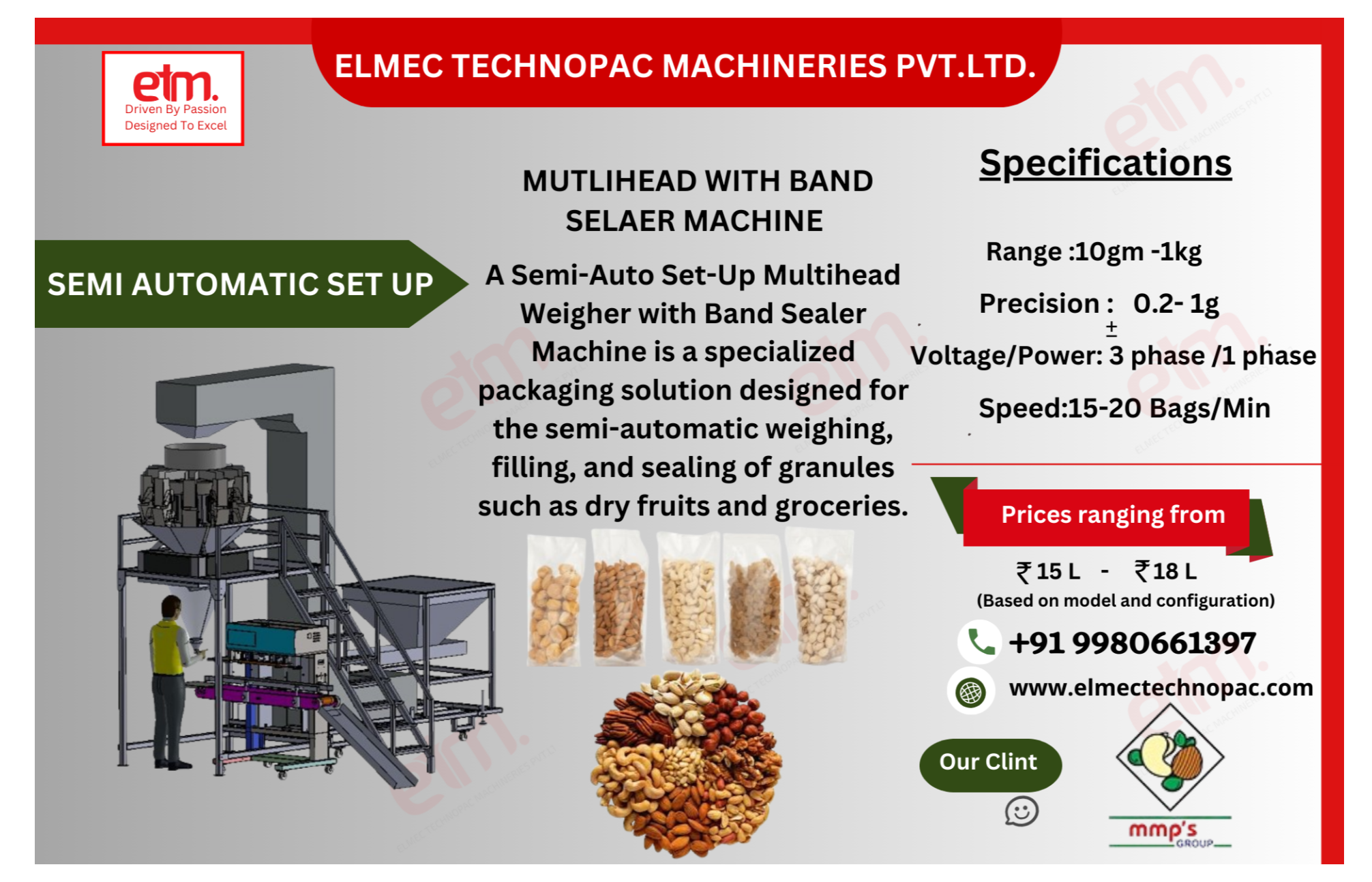 A Semi-Auto Set-Up Multihead Weigher with Band Sealer Machine is a specialized packaging solution designed for the semi-automatic weighing, filling, and sealing of granules such as dry fruits and groceries.