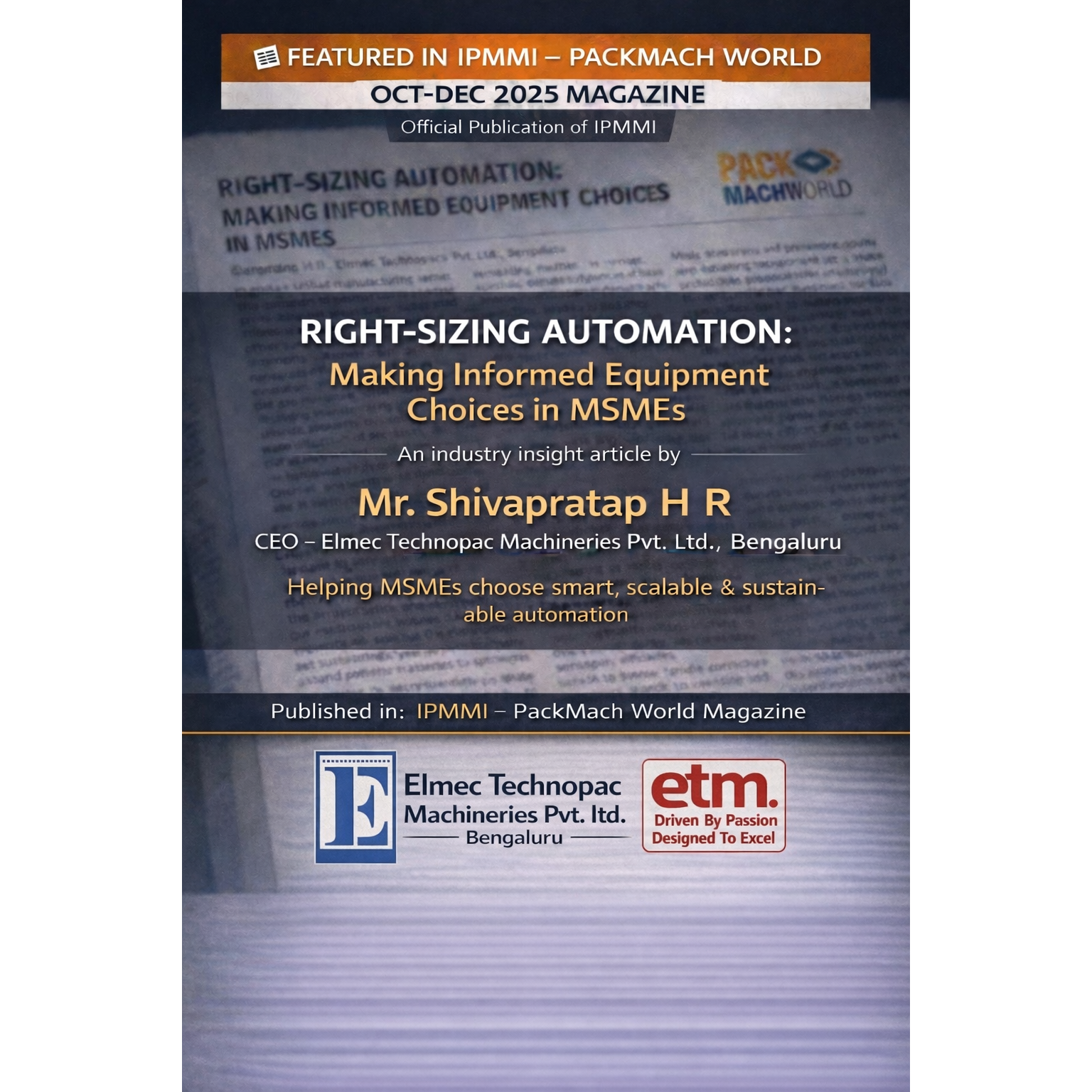 We sincerely thank IPMMI – PackMach World for featuring Elmec Technopac Machineries Pvt. Ltd. in their Oct–Dec 2025 Magazine.
