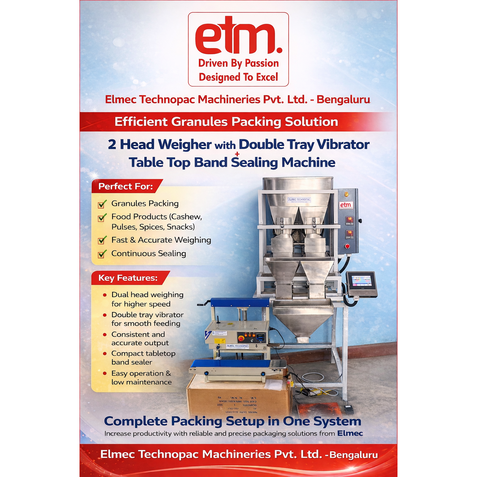 Elmec Technopac Machineries Pvt. Ltd. is a leading pouch packing machine manufacturer in Bangalore, offering efficient granules packing solutions with a 2 Head Weigher and Double Tray Vibrator integrated with a Table Top Band Sealing Machine. Designed for accuracy, speed, and consistent performance, this system is ideal for packing food products like cashews, pulses, spices, and snacks. With easy operation and low maintenance, Elmec ensures reliable and high-quality packaging solutions for your business.
