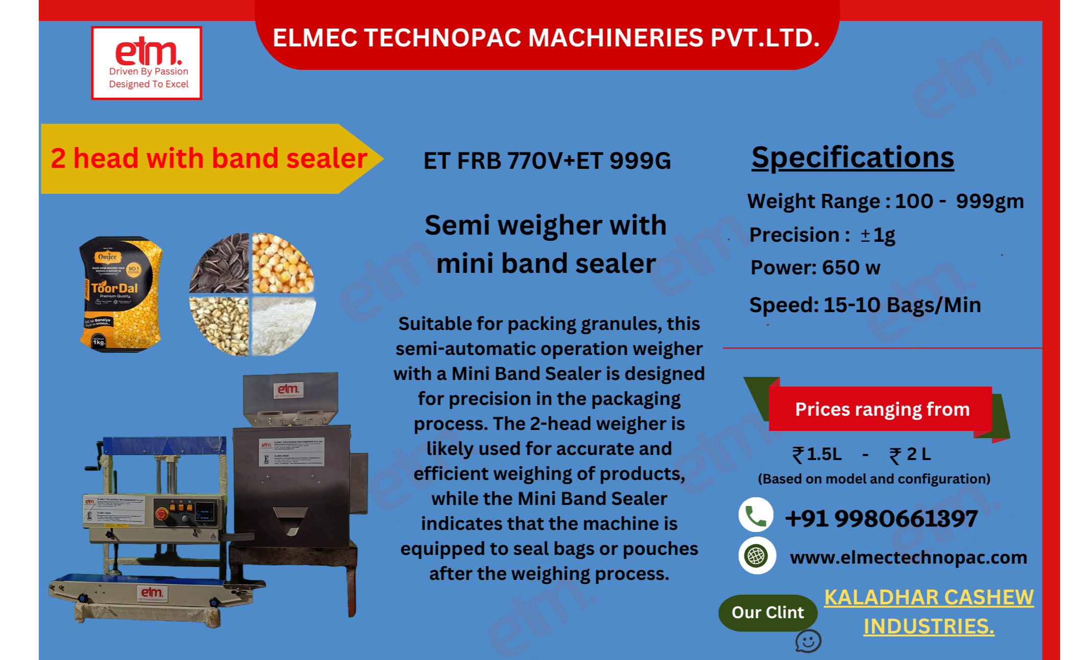 Suitable for packing granules, this semi-automatic operation weigher with a Mini Band Sealer is designed for precision in the packaging process. The 2-head weigher is likely used for accurate and efficient weighing of products, while the Mini Band Sealer indicates that the machine is equipped to seal bags or pouches after the weighing process.