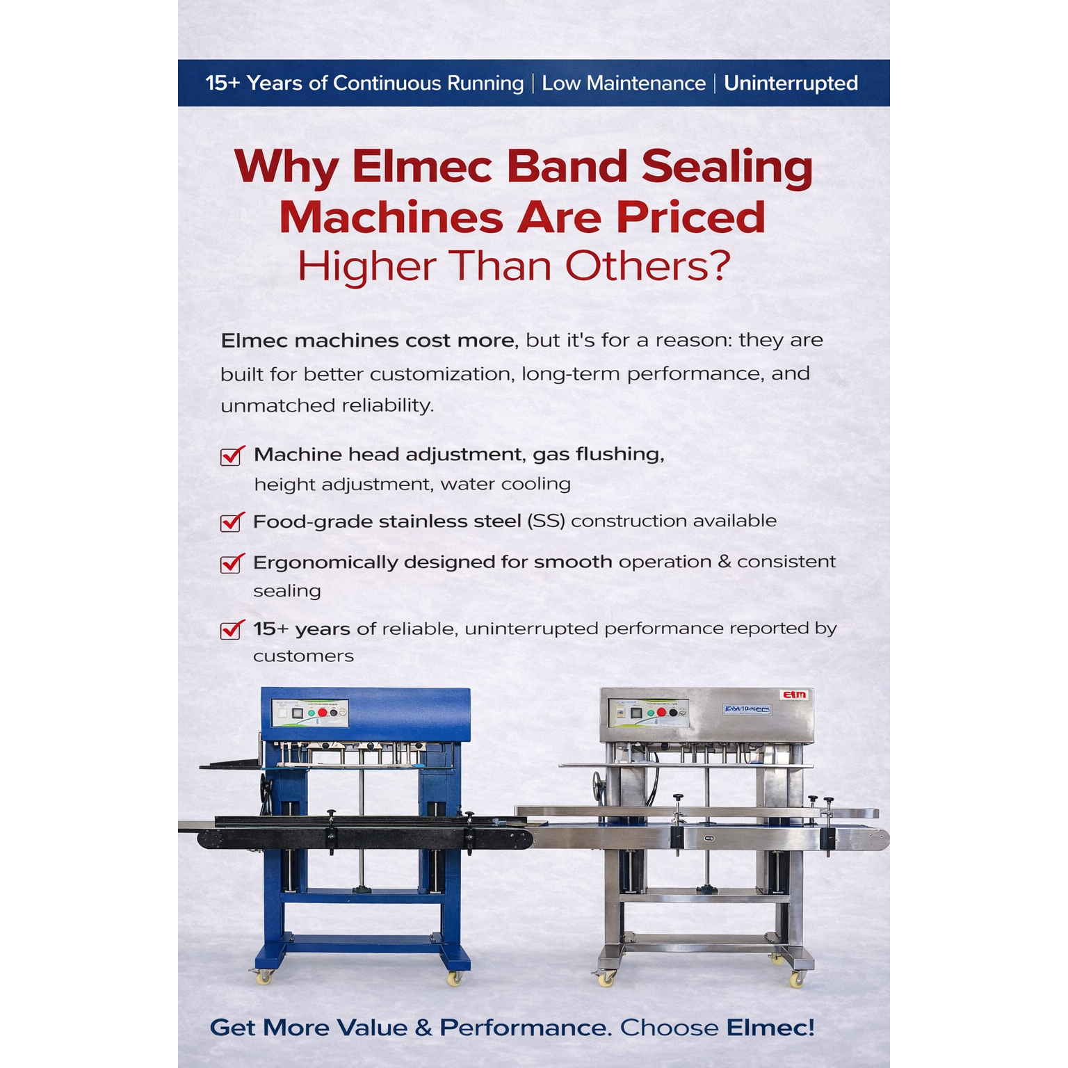 Elmec band sealing machines cost a bit more, but honestly, you get what you pay for. The higher price covers better engineering, more options to customize and long-term performance we deliver