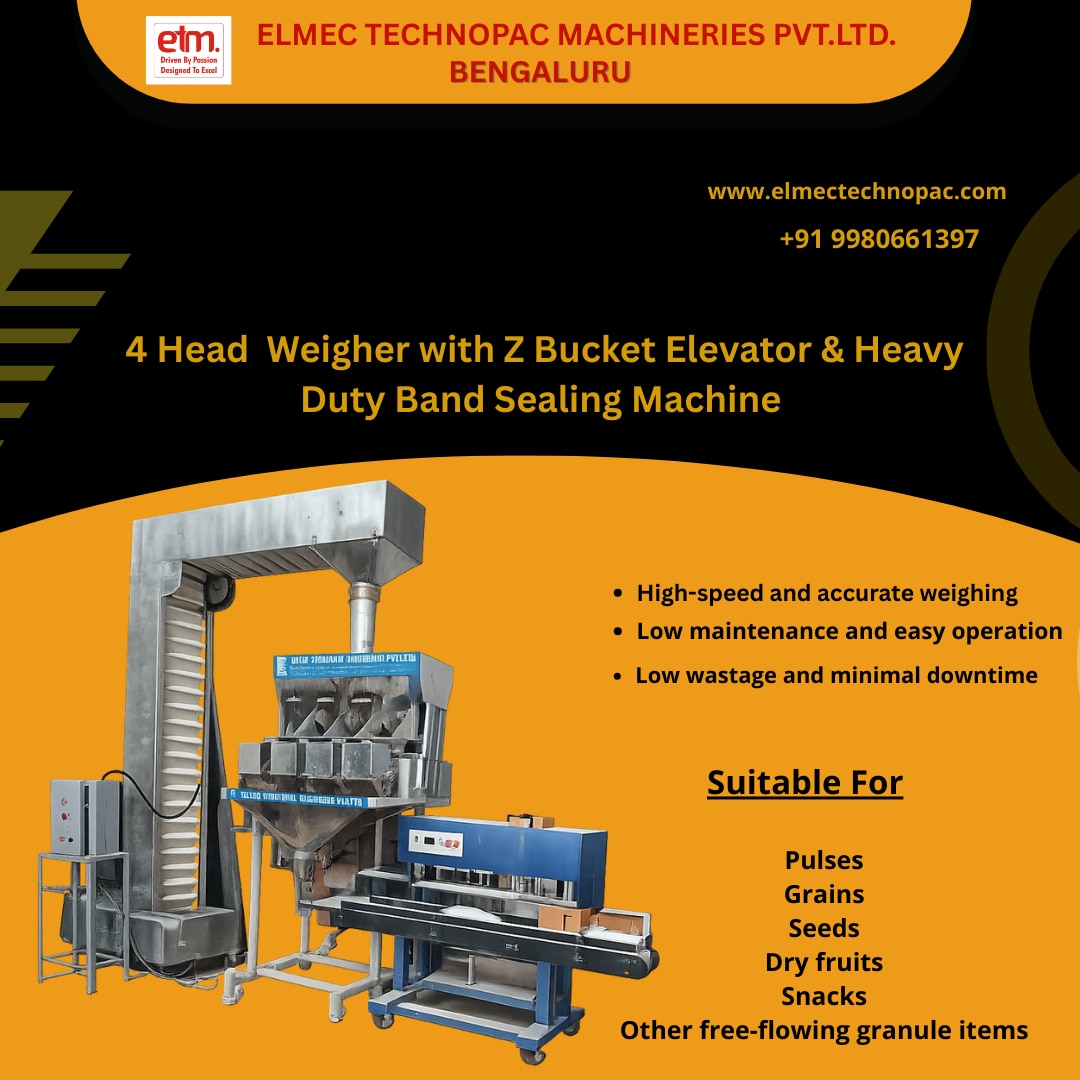 Elmec Technopac Machineries Pvt. Ltd. offers a robust and efficient packaging solution designed specifically for granule products. This integrated system combines a 4 Head Weigher, Z Bucket Elevator, and Heavy Duty Band Sealing Machine to deliver accuracy, speed, and reliability for modern production needs.